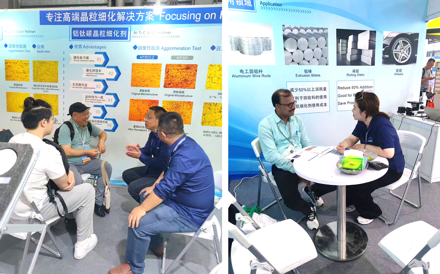 峰越科技此次重點(diǎn)展示了自主研發(fā)的鋁鑭硼(AlLa3B1.5)晶粒細(xì)化劑、6% TiC 顆粒增強(qiáng)復(fù)合材料和鋁鈦碳鈧(AlTi5C0.2Sc)晶粒細(xì)化劑。