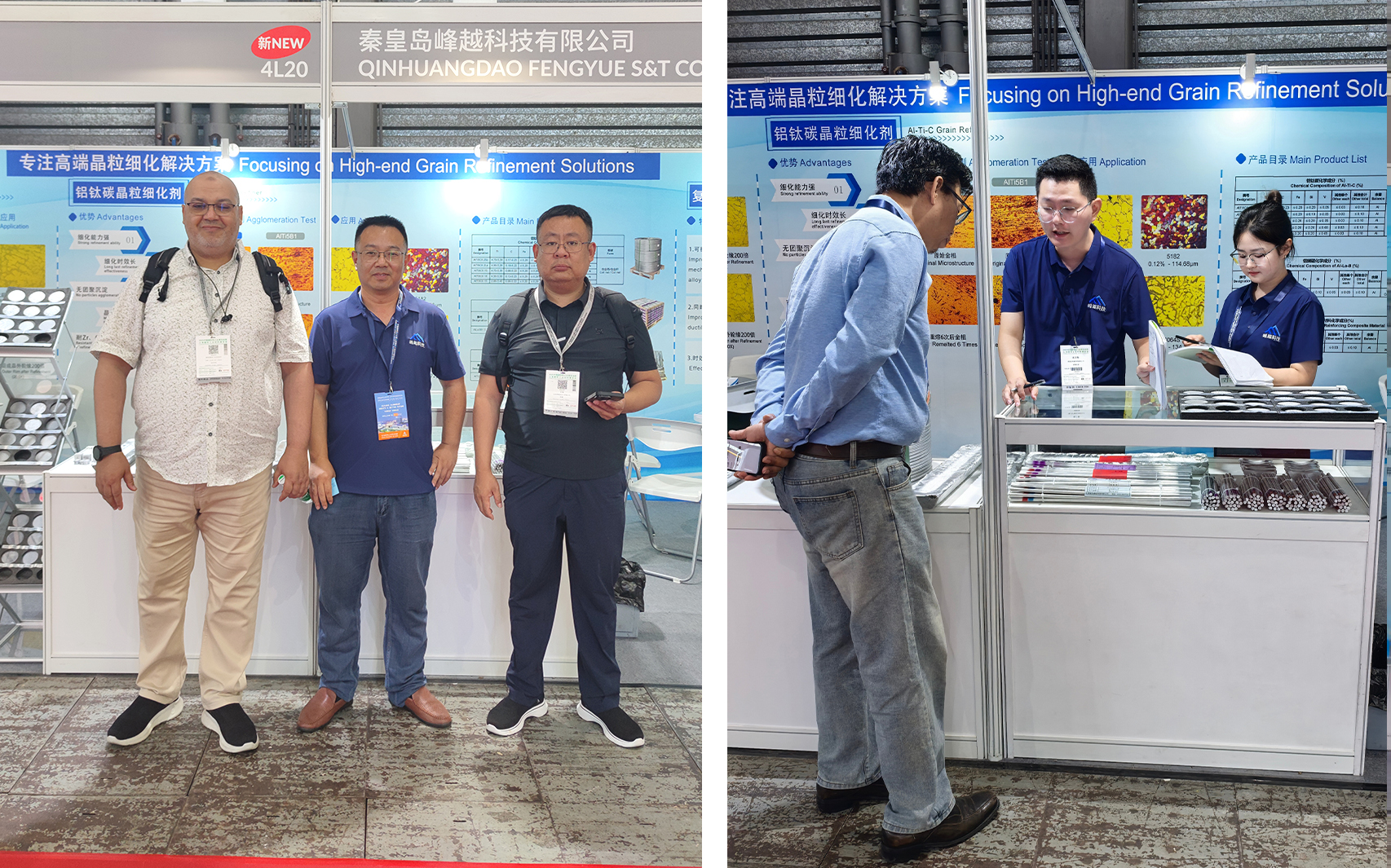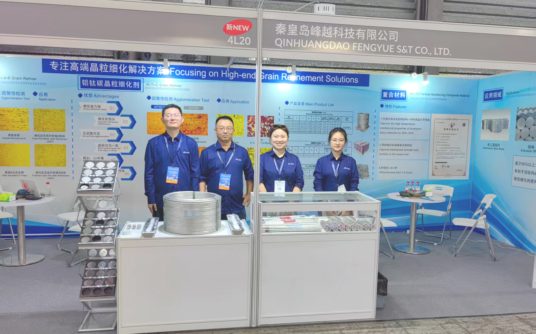 峰越科技此次重點(diǎn)展示了自主研發(fā)的鋁鑭硼(AlLa3B1.5)晶粒細(xì)化劑、6% TiC 顆粒增強(qiáng)復(fù)合材料和鋁鈦碳鈧(AlTi5C0.2Sc)晶粒細(xì)化劑。